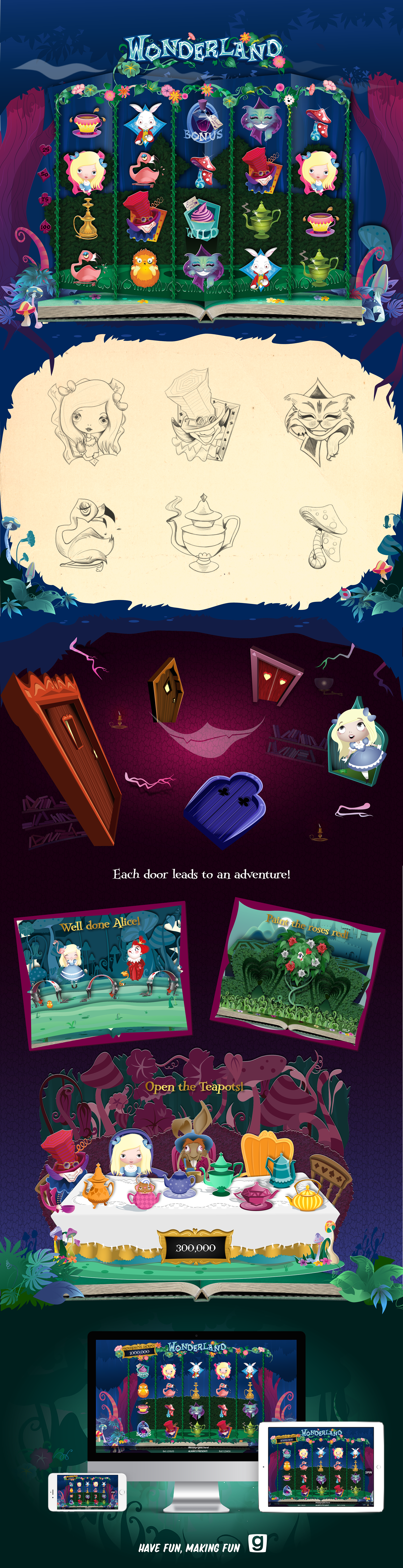 A slot machine game based on a classic fairytale. Follow Alice on and off the reels of Wonderland to reveal the hidden adventures behind the magical doors that land over the reels. Designed to unfold as a pop up book, as the pages turn a new mini game adventure unfolds beneath your eyes.